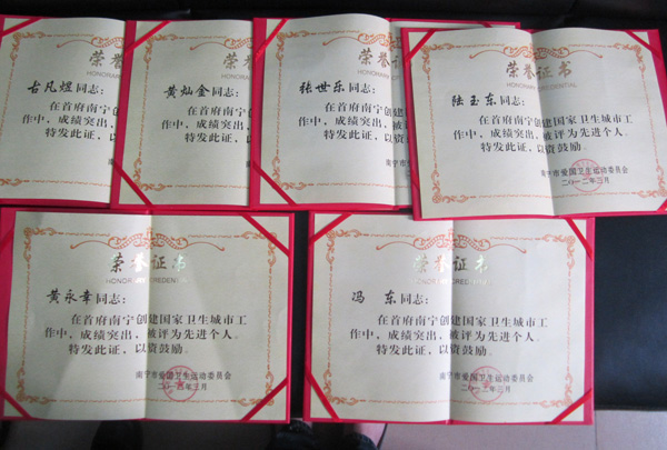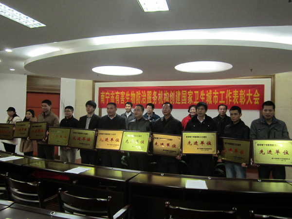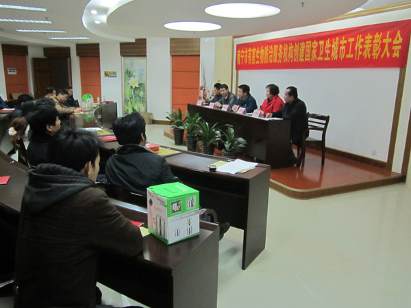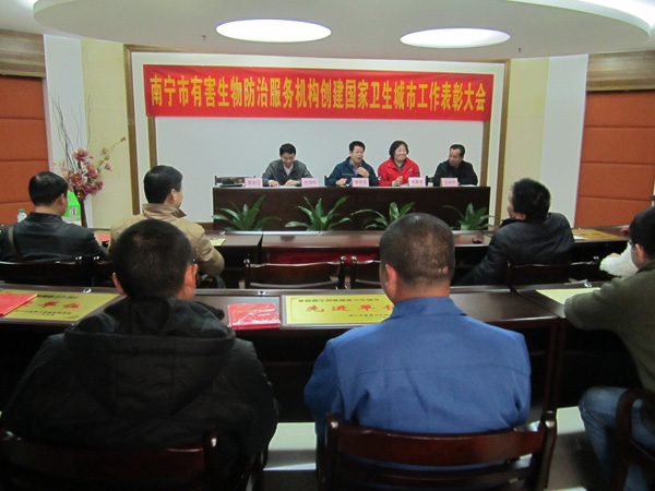 2012年3月8日,由南寧市愛(ài)衛(wèi)辦組織在市衛(wèi)生局隆重舉行了“南寧市有害生物防治服務(wù)機(jī)構(gòu)創(chuàng)建國(guó)家衛(wèi)生城市工作表彰大會(huì)”,南寧市康凈衛(wèi)生消毒殺蟲有限責(zé)任公司在首府南寧市創(chuàng)建國(guó)家衛(wèi)生城市工作中,成績(jī)突出,被評(píng)為先進(jìn)單位以及本公司馮東等6名員工被評(píng)為先進(jìn)個(gè)人,圖為李作慶副主任主持會(huì)議及頒發(fā)證書現(xiàn)場(chǎng)。