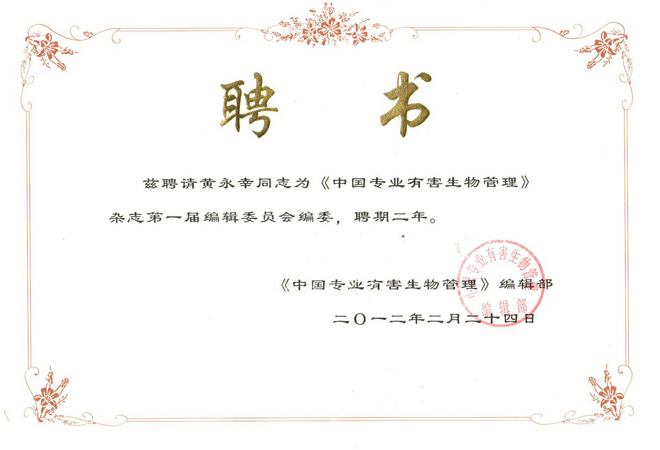 2012年2月24日公司總經理黃永幸先生當選《中國專業(yè)有害生物管理》雜志第一屆編輯委員會編委。